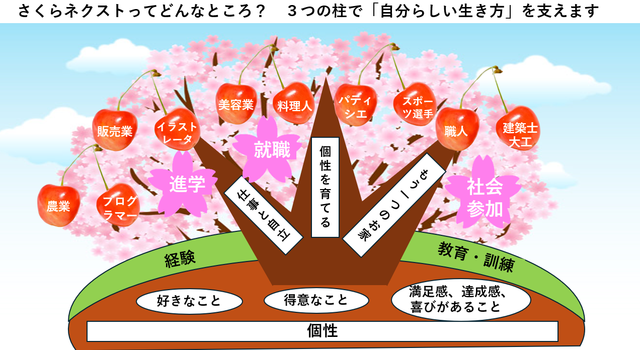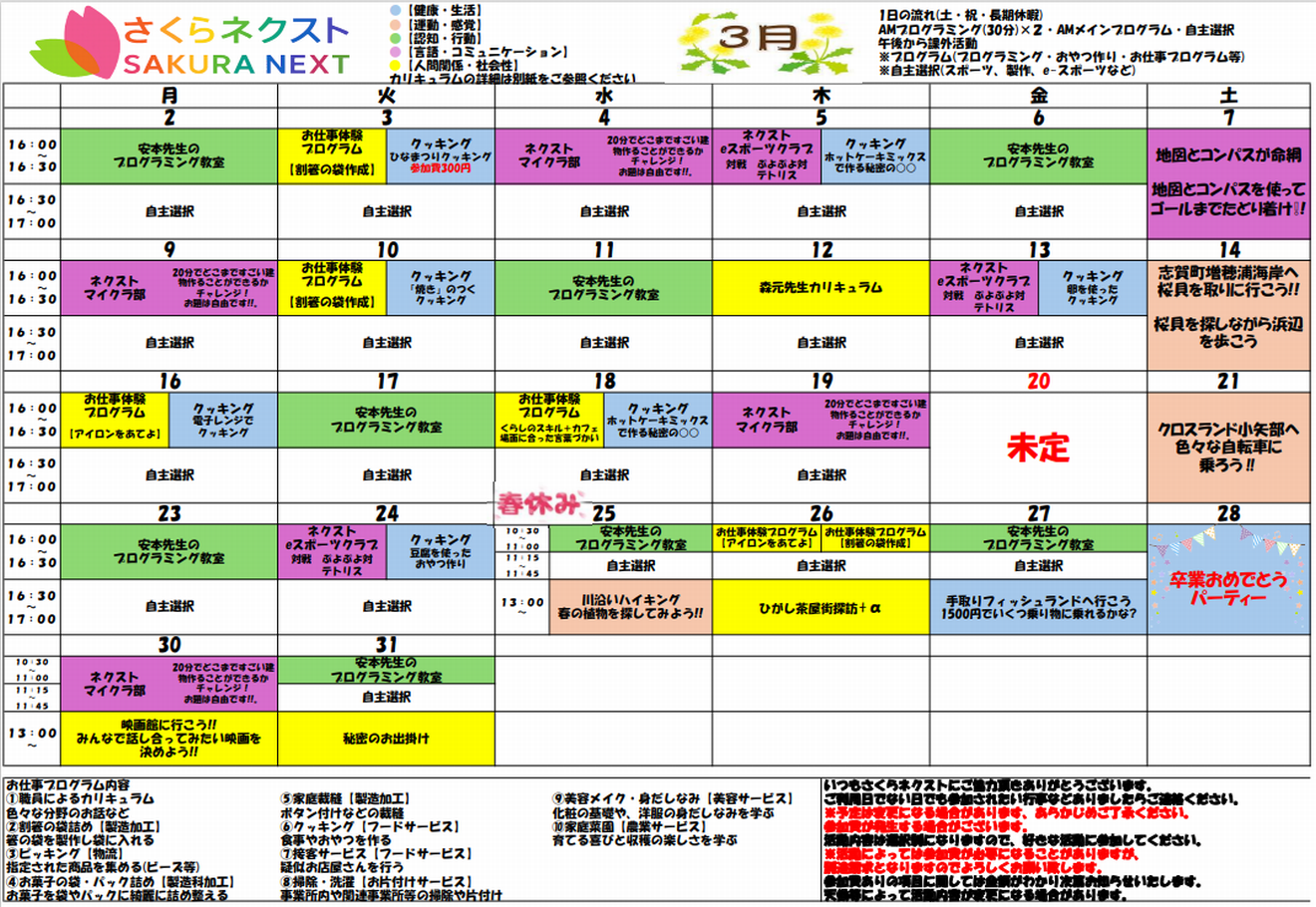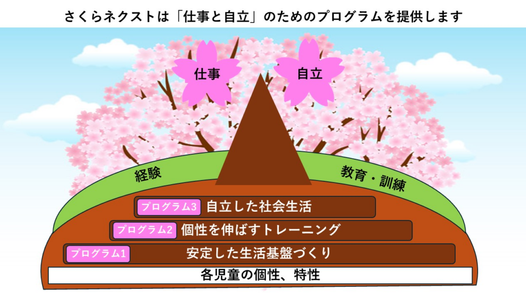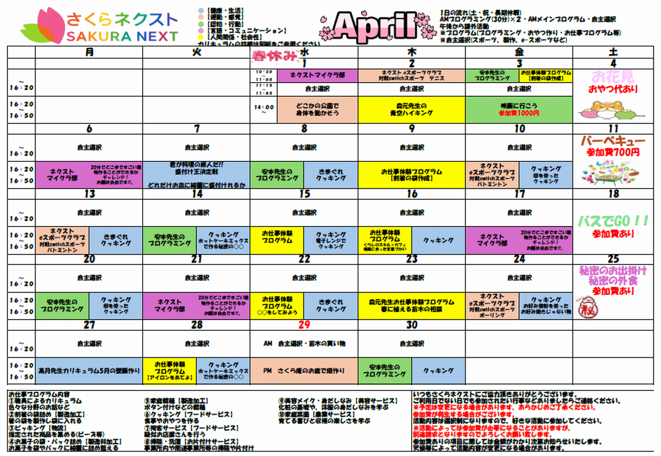「石川県金沢市」「中高生向け」「就労準備型放課後デイサービス」 「石川県金沢市」「中高生向け」「就労準備型放課後デイサービス」 楽しみながら将来の 「自立」と「仕事」を準備する さくらネクストの特長 さくらネクストってどんなところ? 「さくらネクスト」は、一人ひとりの「自分らしい生き方」の選択を支えることを理念とします。一人ひとりが安心できる「居場所」を提供することはもちろん、社会の一員として自立し、働くことの喜びや困難を乗り越える力を育むことを目指します。子どもたちが自信を持って社会へ羽ばたけるよう、スモールステップを重ねながら成功体験を積み上げ、自己肯定感を高める支援を行い、未来への「次の(Next)ステージ」へと繋げる架け橋となります。 さくらネクストは、次の3つの柱で個性を育て「自分らしい生き方」を支えます。 個性を育てる もう一つのお家 仕事と自立 ・個性を育てる ・もう一つのお家 ・仕事と自立 1. 個性を育てる 「さくらネクスト」は、一人ひとりの個性を大切にします。その子の個性、持ち味を大切にし、「自分の好きなこと」、「自分の得意なこと」、「自分から取り組めて満足感・達成感・喜びのあること」に取り組むことを通して、達成感・自己肯定感を育て、その子の個性を育てます。 2. もう一つのお家 「さくらネクスト」は、ゆっくり休んだり、友達と遊んだり、おやつを作って食べたりして、お家のように安心してやすらげる居場所「もう一つのお家」を提供します。 3. 仕事と自立 「さくらネクスト」は、社会の一員として自立し、働くことの喜びや困難を乗り越える力を育むことを目指します。子どもたちが自信を持って社会へ羽ばたけるよう、スモールステップを重ねながら成功体験を積み上げ、自己肯定感を高める支援を行います。 「考える力」を育む実践的なプログラミング教育 将来の仕事に不可欠な論理的思考力と創造力を、プログラミングを通じて育成します 。少人数制(3〜5 人程度)のグループワークで「考える→作る→発表する」のサイクルを回し 、発信力や協調性も高めます 。 地域に根ざした多様な「働く」体験学習 一般企業や就労施設への見学・体験に加え 、加賀伝統工芸(蒔絵や友禅染め)といった地域特有の文化に触れる機会も提供し 、「自分の持つ能力はどの仕事に向いているのか」を深く考えるサポートをします 。 心と身体の成長を促す複合的スキルアップ 心と身体の成長を促す複合的スキルアップ スポーツを通じた体力の向上と 、アイロンビーズや裁縫といった微細運動による手先の巧緻性と自信の獲得、問題解決能力の育成に取り組み、社会生活の基盤となる力を築きます。 こんな方におすすめ こんな方におすすめです 〇放課後の時間を有意義に過ごしたい中・高校生〇学校生活や就職活動に不安を感じている中・高校生〇安心して過ごせる場所を探している中・高校生 カリキュラム PDFを見る(260KB) PDFを見る(260KB) さくらネクストプログラム紹介 プログラム1 安定した生活基盤づくり プログラム1安定した生活基盤づくり ・就労や生活の基礎となる健康な体と、身の回りの自立を目指します。・運動での体力作りや料理・掃除などの家事スキルを習得し、安定した生活基盤を築きます。 運動 ・体力向上やストレス発散、余暇の楽しみ方を学びます。 家事スキル ・クッキング:栄養バランスや健康管理の基礎を学びます。・掃除・洗濯:整理整頓や衛生管理が出来る能力を身に付けます。 身だしなみ ・TPO に合わせた服装や身だしなみを学び、相手に好印象を与える清潔感を身につけます。 栽培活動 ・植物の世話を通じて命の大切さを学び、継続して取り組む責任感や情緒を育てます。 プログラム2 個性を伸ばすトレーニング プログラム2個性を伸ばすトレーニング ・手先を使う作業トレーニングやプログラミング、時間管理、コミュニケーション(SST) を通じ、業務遂行に必要な集中力と、円滑な対人スキルを喜びや達成感のある活動を通じて自己肯定感を高めながら伸ばします。 プログラミング ・PC 操作やプログラミングを学び、現代社会で活躍するための IT スキルを身に着けます。 インターネット インターネットを使うことで、情報収集の効率化、コミュニケーション能力の向上を図る。これにより、現代社会での生活を豊かにし、現代社会で活躍するスキルを身に付ける。 作業トレーニング 裁縫やアイロンビーズ作り、袋詰め等の作業を通じ、集中力の持続や、手順通りに仕上げる正確性を磨きます。・塗り絵:集中力を持続させます。・アイロンビーズ:手順を理解し、最後まで仕上げます。・割り箸袋入れ:単純な作業を効率よく一定の品質で続けます。・ミシン等の裁縫:危険予測や道具の適切な使用を学びます。 プログラム3 自立した社会生活 プログラム3自立した社会生活 買い物や公共交通機関の利用、職場見学などの実体験を通じ、社会のルールを知り、自信を持って自立した生活を